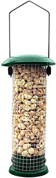 This tall GrayBunny Premium Steel Sunflower and Peanut Feeder is about as simple as it gets. Its form is just a long, tubular shaft with a net-like feeding area. We think it could have a better design because there are no perches for the jays—they’ll have to work a bit harder to latch on and will most likely go back and forth from their nest to the feeder to stock up.